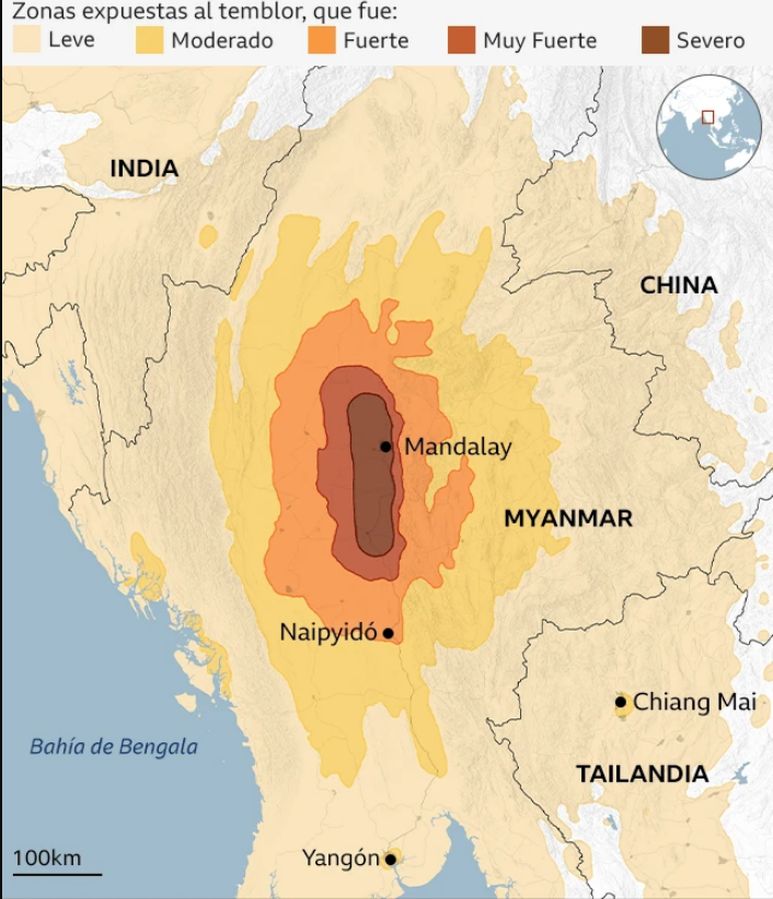 Las zonas más afectadas en Myanmar incluyen Mandalay y Sagaing, donde se reportan al menos 144 fallecidos y 732 heridos. En Tailandia, el sismo también tuvo consecuencias devastadoras, con el derrumbe de un rascacielos en construcción en Bangkok, dejando atrapados a más de 80 obreros.